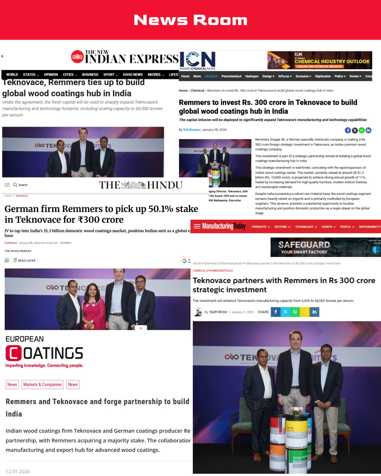We are happy to announce our strategic partnership with Remmers Group Germany where Remmers will acquire 50.01% strategic stake in Teknovace with a total of 300 Crores investment in two tranches. In many ways this partnership is historic in nature as it has potential to change the dynamics of Wood Coating supply chain by creating a deep tech integrated manufacturing hub in India catering not only to the Indian market but also to a large part of the global market.